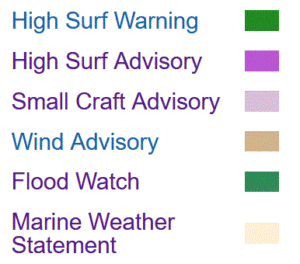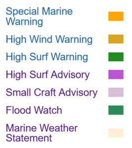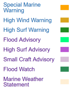 Glen, Really love your daily weather narrative especially since we are neighbors and I’m always interested in the morning temperature! However, I have been missing the color codes as to high wind advisories, flooding, small craft warnings,efc? Is this a problem on my end?